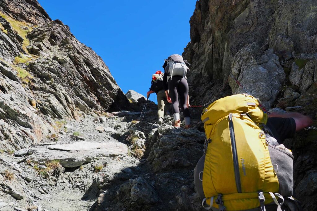 The plan called for one more day hiking up to a hut on the far side of the valley, and then a second and final day descending into Zermatt. Those trails included a 500-meter suspension bridge and two kilometers of fixed chains. (“Fixed chains” are metal chains bolted to the rock that even people who are not afraid of heights are expected to hold onto for safety’s sake.) An avalanche had closed a section of the trail. This now required an extra descent to the valley and an extra climb back up to rejoin the trail beyond the closure. Not to mention, the weather forecast was threatening rain.